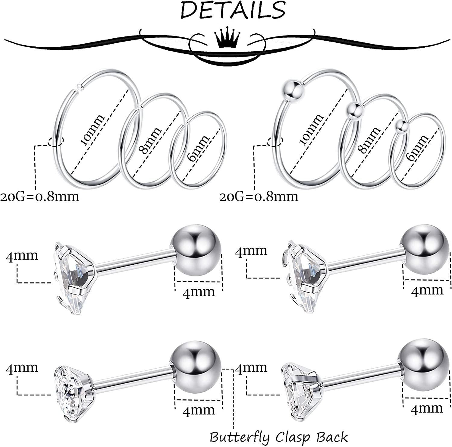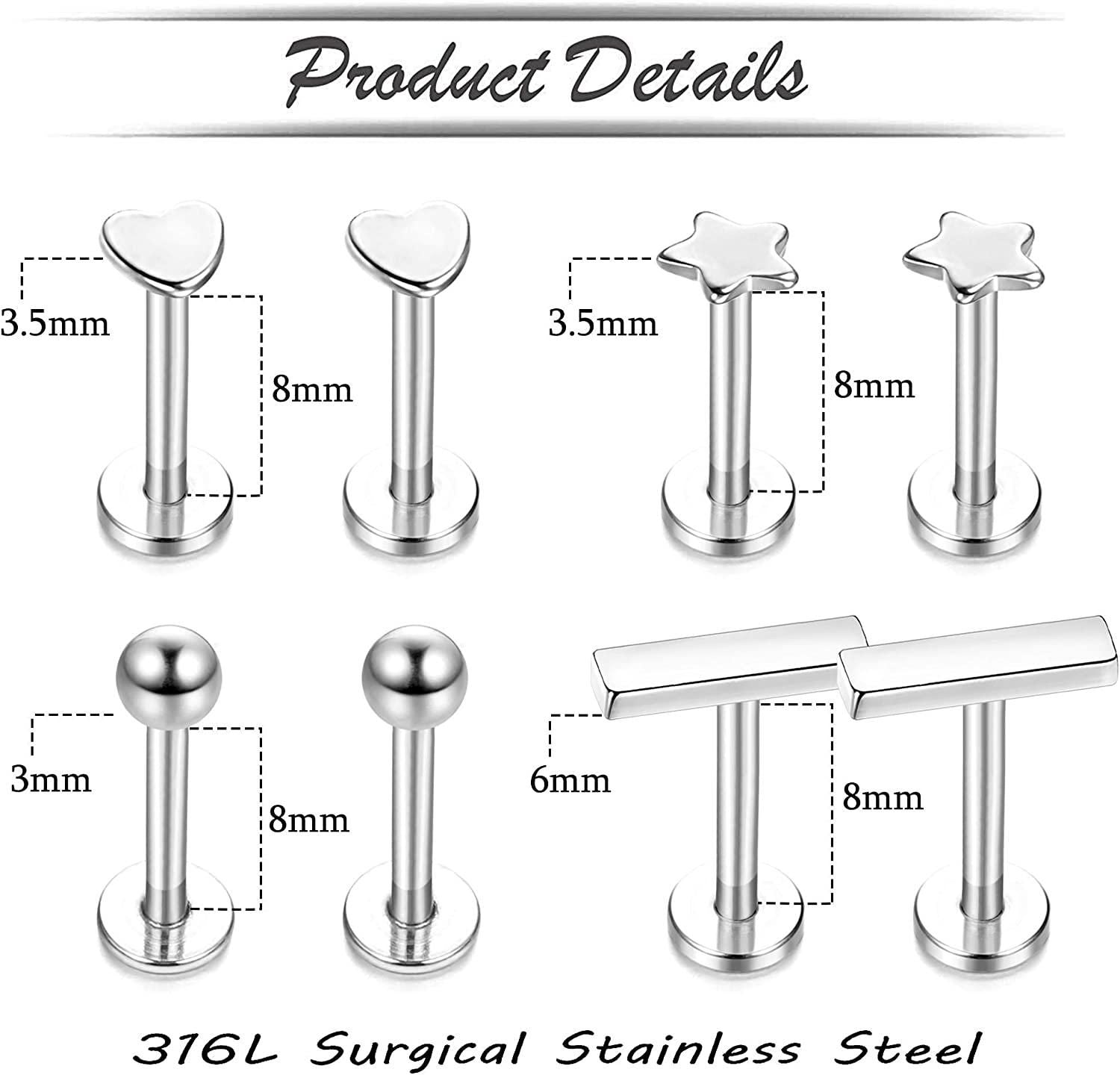 Gauge&Size:16G(1.2mm); Wearable Bar Length: 8mm; Regular Piercing Gauge and Length for Most of the People.All in Silver Tone.Classic and Popular; Never Fade or Rust.Comfortable to Use.Give you Different Kinds of Choices