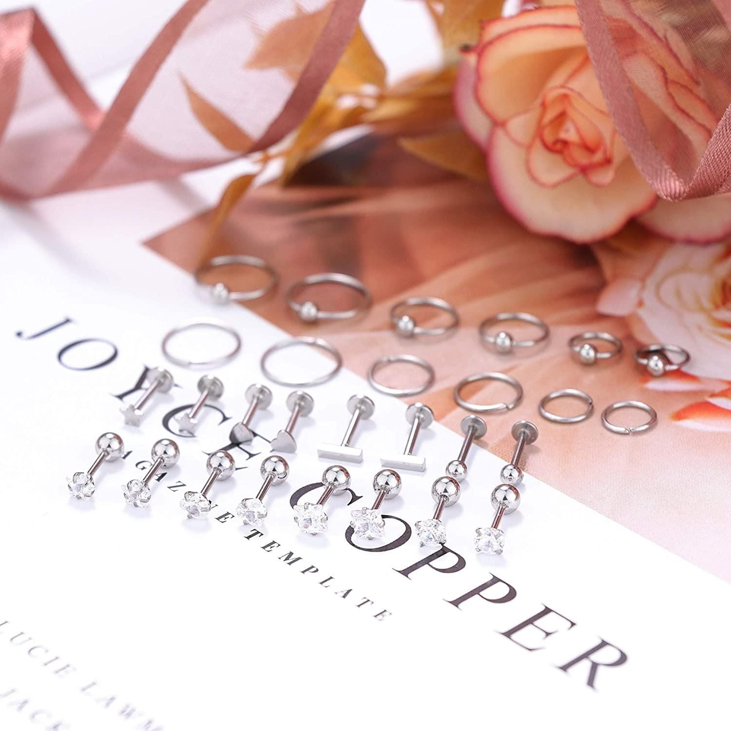 Affordable Set:One Order includes 14Pcs; 4 Styles Stud Piercing; Clear CZ Internally Threaded; Clear Bioflex Internally Threaded; Bar/ Star/Heart Stud Style; 4Styles Lip Rings 6Pairs Hoop EarringsMeet All Your Needs.Simple But Stylish; More Options for Your Daily Wearing.